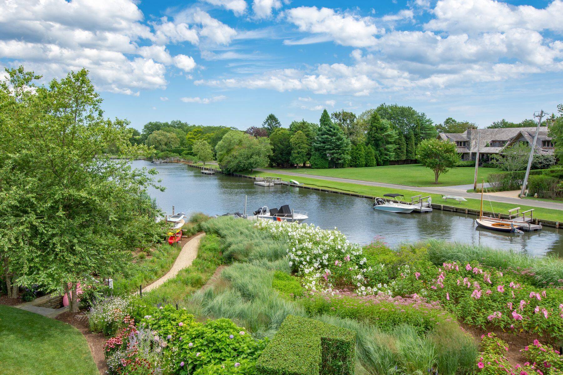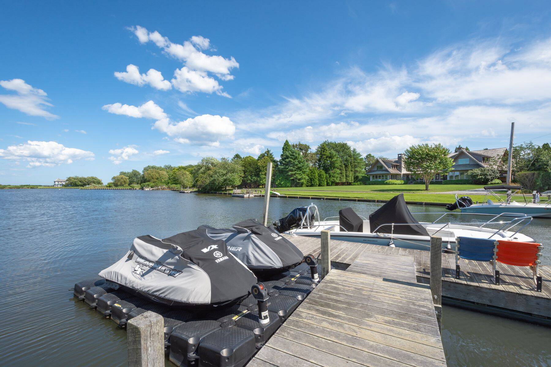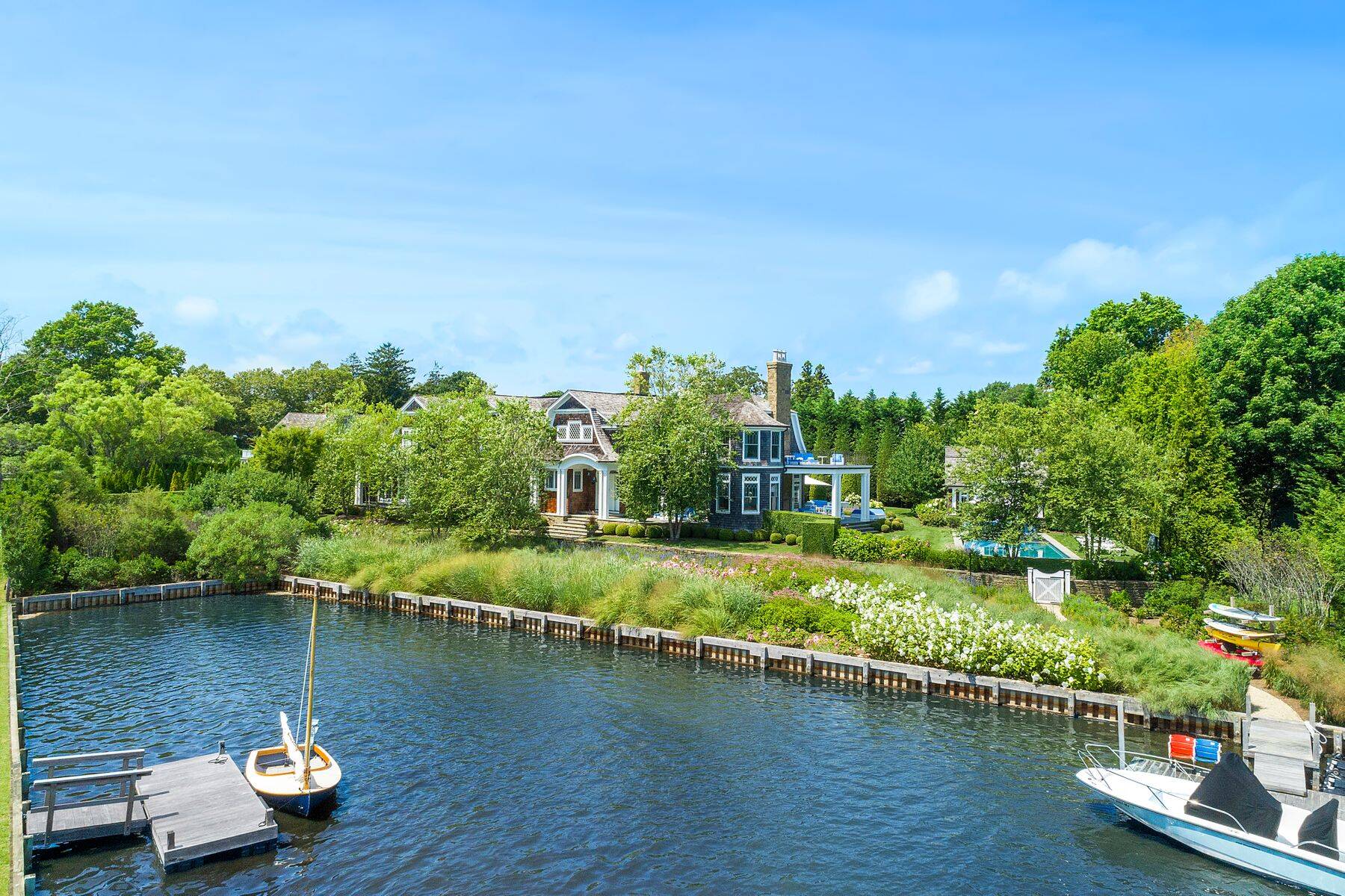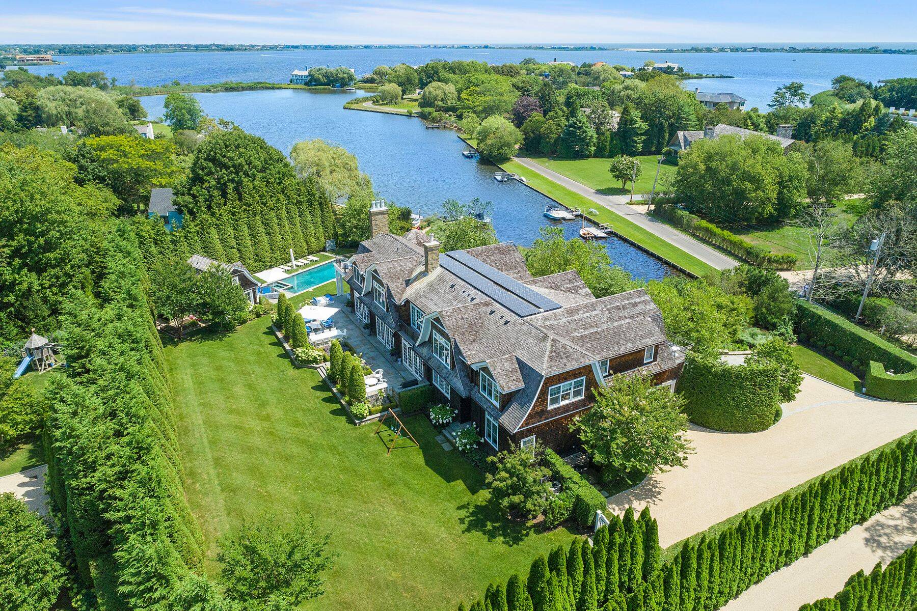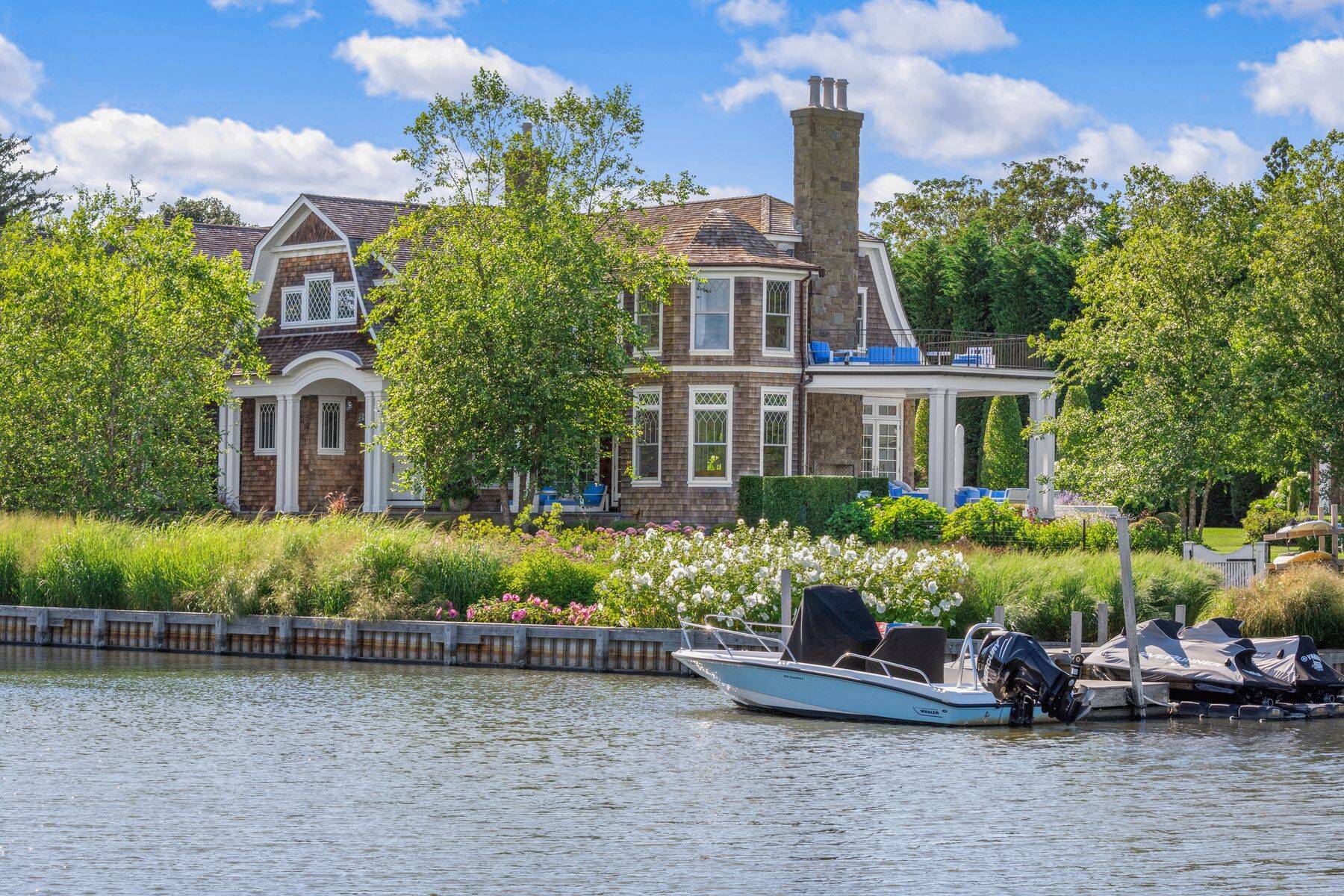 Immediate access to boats and boating is available to only a few on the east end. Combined with a terrific house this property is truly unique. Sunny, spacious and shingled, this 7,650 sq.ft. sits elegantly on one waterfront acre, entirely surrounded by beautiful gardens and mature trees. The architectural design by McDonough & Conroy is smart and takes advantage of the lovely and private setting. Indoor /outdoor living is created by principal rooms having large views with glass doors that access the extensive and inviting bluestone patios and porches. Here, one can entertain on a lofty scale or comfortably retreat to a simpler and quieter lifestyle. The first floor includes a grand 2 story foyer, a living room and dining area separated by a 2 sided fireplace, a large great room with a fireplace and a separate waterside lounge, an oversized kitchen w custom cabinetry, an immense stone center island, commercial grade appliances and designer lighting. There is a large TV room with a wet bar, a powder room and a staff area with an en-suite bedroom and laundry area. The second floor offers a large rec/game room with a full bath, a large walk in closet and a sundeck. Additionally, there 5 elegant en-suite bedrooms several with sundecks. Also included is a large 1000 (+/-) sq.ft. private primary bedroom suite with a fireplace, a stunning marble bath with radiant heat and a cozy lounge area that accesses a waterside deck. Accessory structures include an attached heated 2.5 car garage, a 18 x 40" heated pool with an electric cover and a pool house with heat and A/C, a kitchenette, and a full bath. There are 275 feet of bulkheaded waterfront with a floating dock. One can have a power boat, jet skis, kayaks, and paddle boards. The address is prestigious and the road is private. The house is in excellent condition and ready for immediate occupancy.
