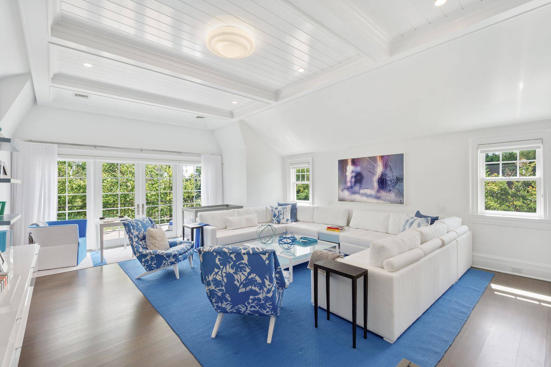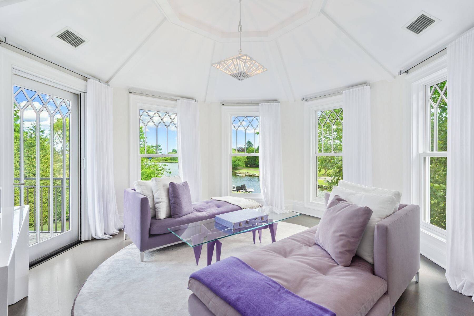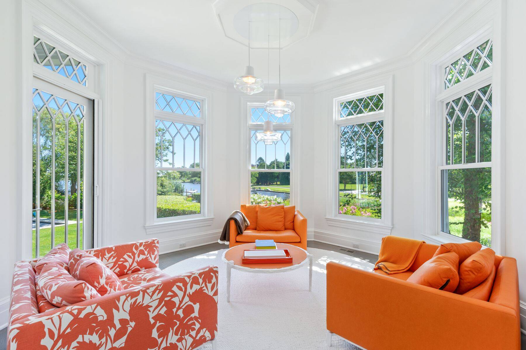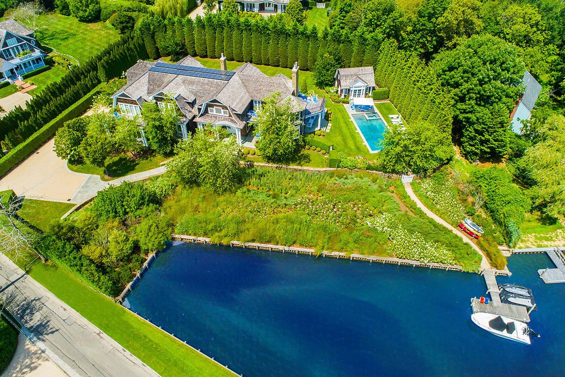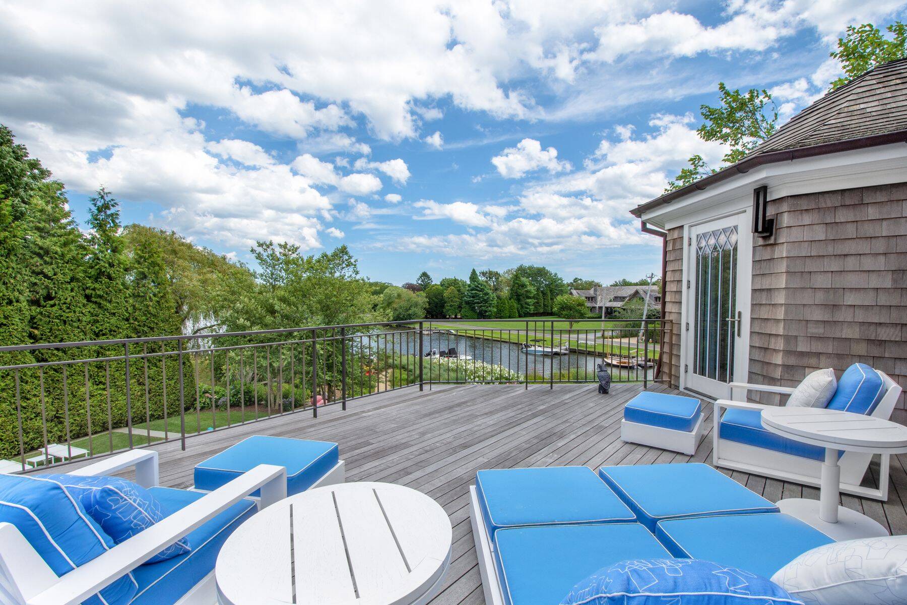 Immediate access to boats and boating is available to only a few on the east end. Combined with a terrific house this property is truly unique. Sunny, spacious and shingled, this 7,650 sq.ft. sits elegantly on one waterfront acre, entirely surrounded by beautiful gardens and mature trees. The architectural design by McDonough & Conroy is smart and takes advantage of the lovely and private setting. Indoor /outdoor living is created by principal rooms having large views with glass doors that access the extensive and inviting bluestone patios and porches. Here, one can entertain on a lofty scale or comfortably retreat to a simpler and quieter lifestyle. The first floor includes a grand 2 story foyer, a living room and dining area separated by a 2 sided fireplace, a large great room with a fireplace and a separate waterside lounge, an oversized kitchen w custom cabinetry, an immense stone center island, commercial grade appliances and designer lighting. There is a large TV room with a wet bar, a powder room and a staff area with an en-suite bedroom and laundry area. The second floor offers a large rec/game room with a full bath, a large walk in closet and a sundeck. Additionally, there 5 elegant en-suite bedrooms several with sundecks. Also included is a large 1000 (+/-) sq.ft. private primary bedroom suite with a fireplace, a stunning marble bath with radiant heat and a cozy lounge area that accesses a waterside deck. Accessory structures include an attached heated 2.5 car garage, a 18 x 40" heated pool with an electric cover and a pool house with heat and A/C, a kitchenette, and a full bath. There are 275 feet of bulkheaded waterfront with a floating dock. One can have a power boat, jet skis, kayaks, and paddle boards. The address is prestigious and the road is private. The house is in excellent condition and ready for immediate occupancy.