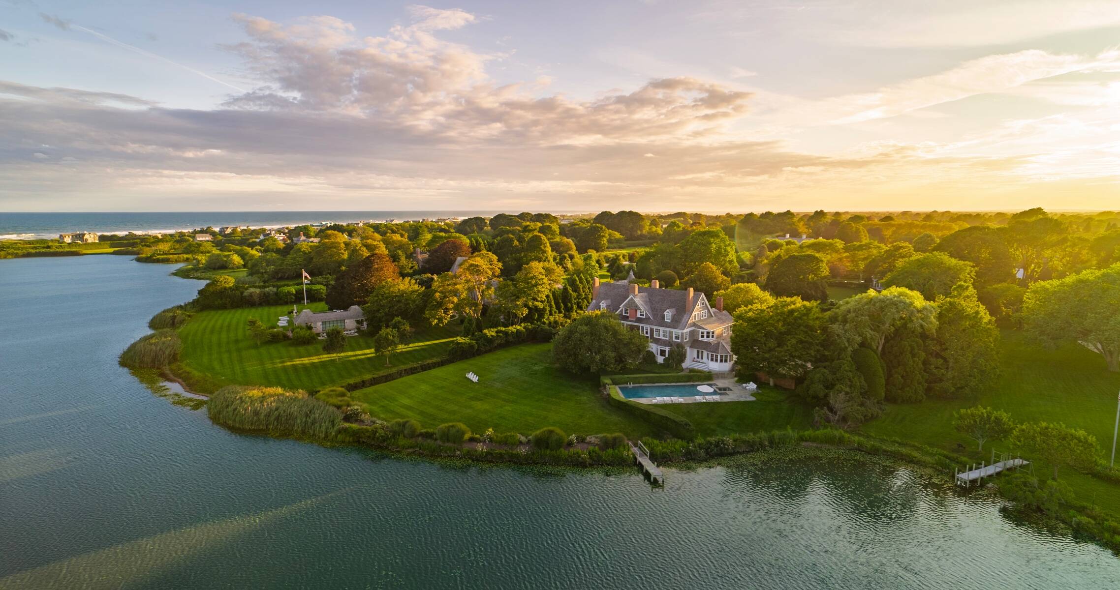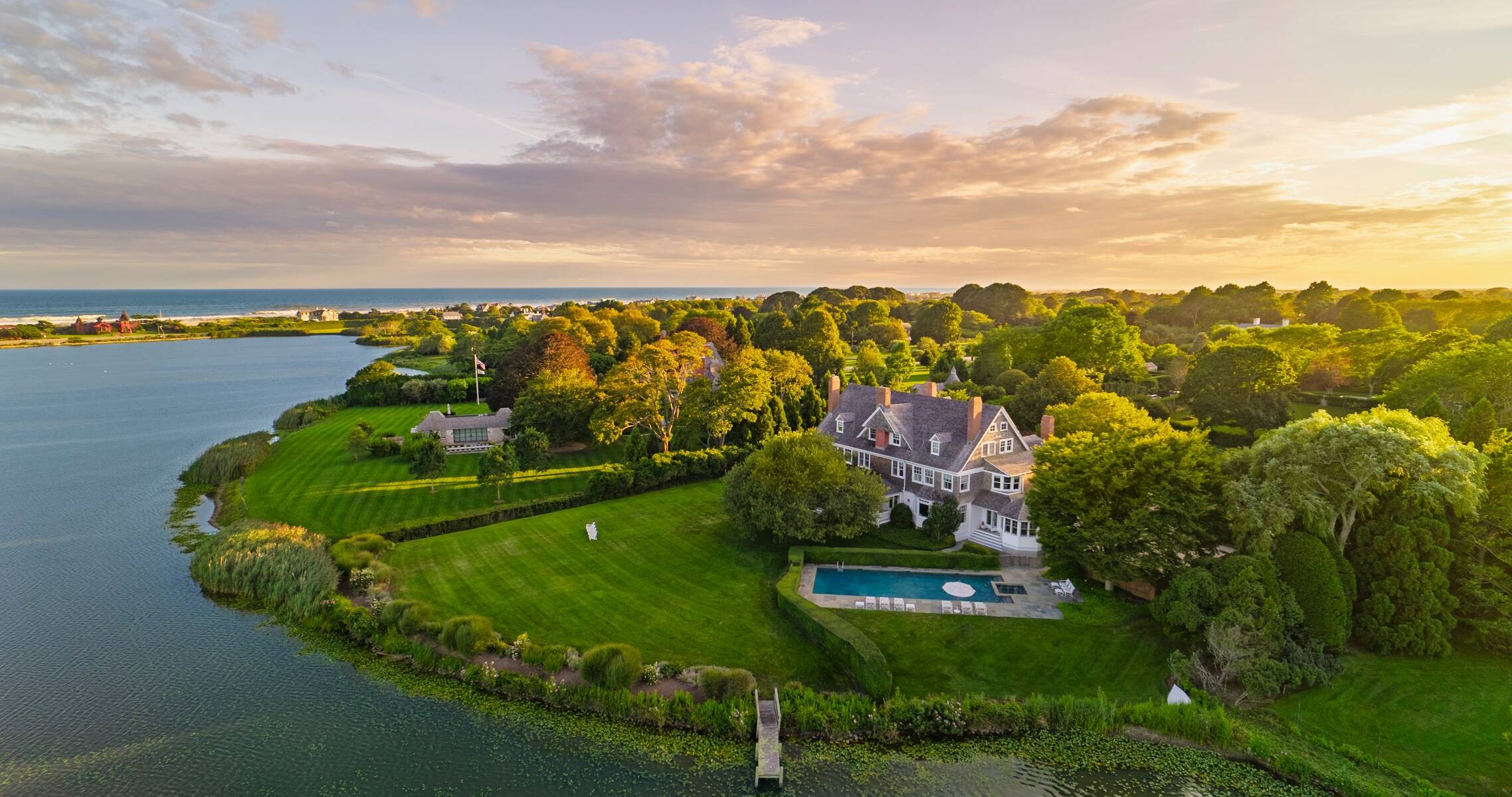 This exceptional residence offers over 260' of waterfront, a dock and lakeside heated pool and spa. The 11,000+sf house, designed by America's premiere architect Stanford White, is ideally planned for both formal entertaining and casual enjoyment. The living room, formal dining room, breakfast room and den all feature expansive lake views. The eat in kitchen opens to a family room. Over 3 levels, there are 11 double bedrooms 11 baths plus 2 staff rooms and a bath. The primary suite, on the second floor, faces southeast to lake and ocean views. Exceptionally wide covered porches wrap around the shingled exterior and provide additional areas to entertain and relax. Ideally located near ocean beaches and Southampton's village center. Featured with its own chapter in The Houses of McKim Mead & White this revered architectural masterpiece, is one of Southampton's most iconic treasures.