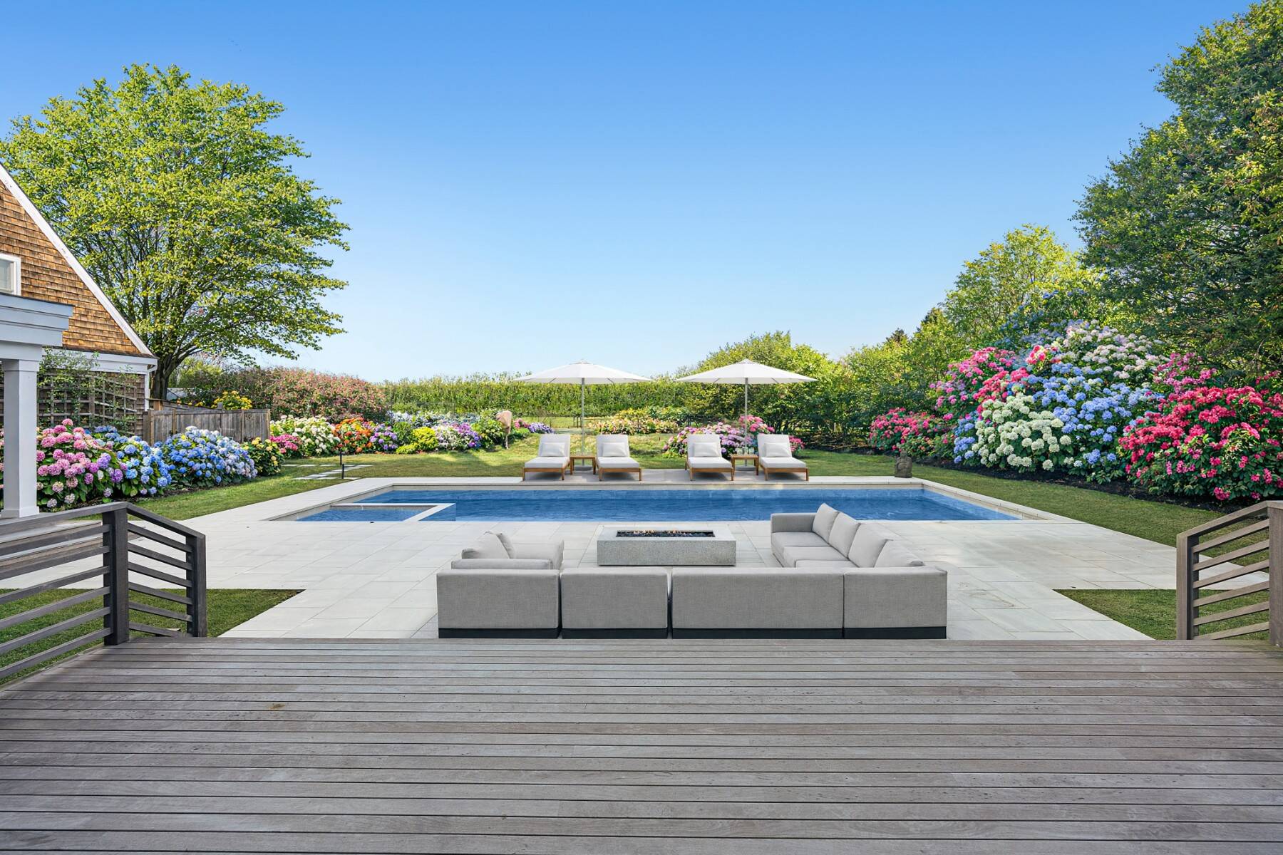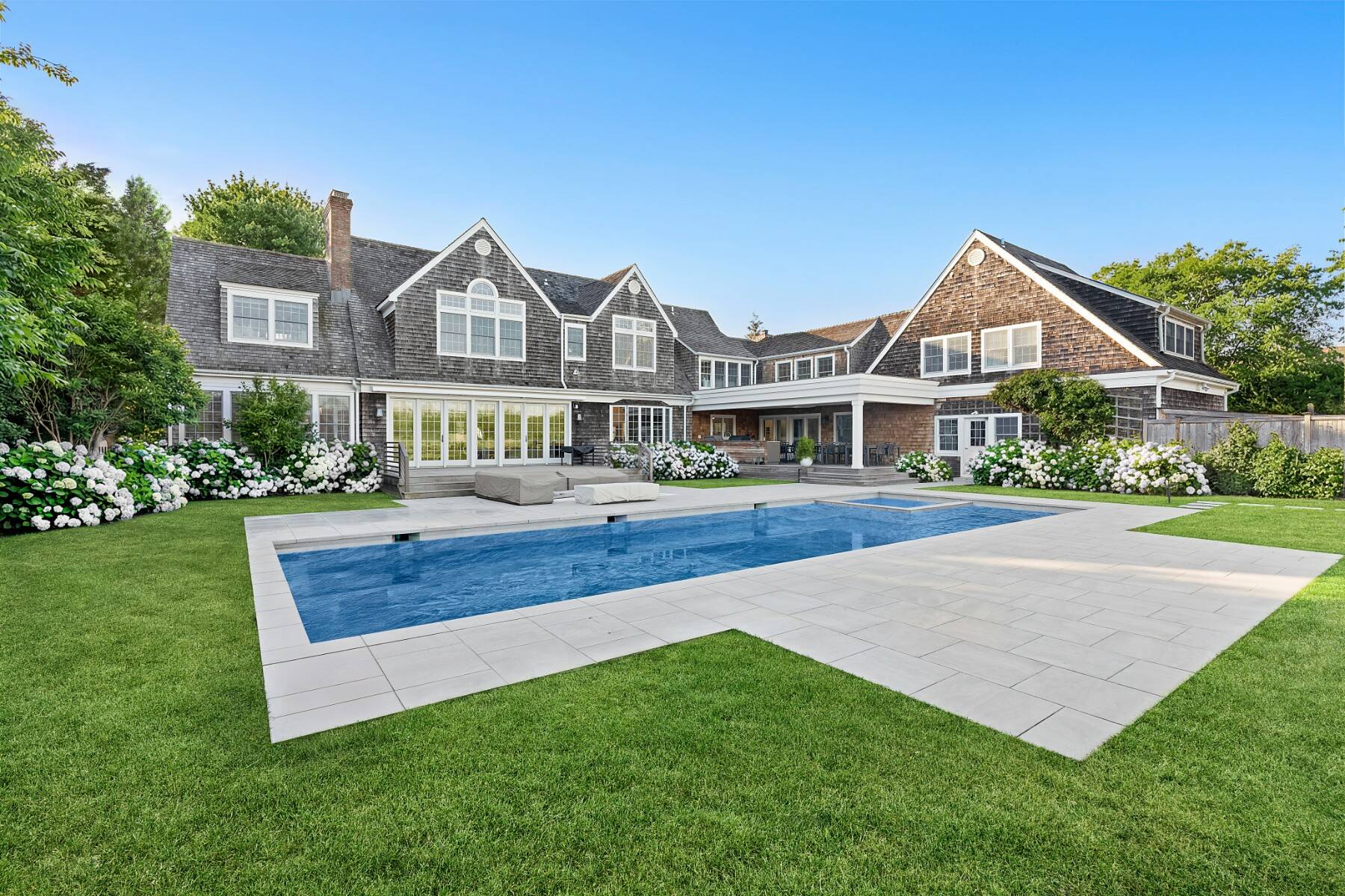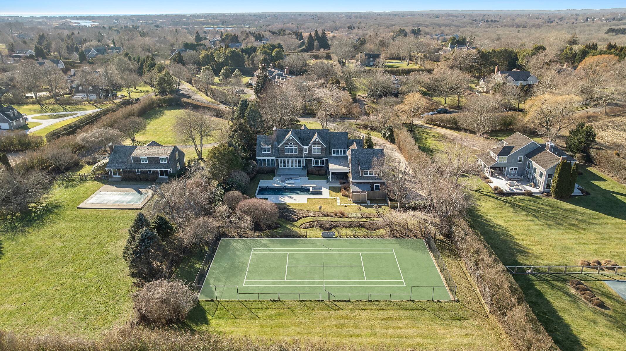 Situated on a quiet cul-de-sac south of the highway in Sagaponack, this extensively updated, sun-filled Hamptons classic backs up to an agricultural easement and features a Har-Tru tennis court. The residence offers five bedrooms, five full baths, a half bath and a three-car attached garage. The main level includes a spacious great room with fireplace and multiple doors to the rear deck and patio, a sunroom with oversized windows, formal dining room with full wet bar, private office and a new eat-in kitchen fully equipped with stainless steel appliances. The kitchen also includes an oversized island, breakfast nook and seating area with wood-burning fireplace. A large butler's pantry with additional full-size refrigerator, freezer and wine storage as well as a laundry room, powder room, full pool bath and three-car garage complete the main level. The second floor features an expansive, vaulted primary suite with sitting room, both overlooking the pool and tennis court, with double-sided fireplace, two walk-in closets and a luxurious primary bathroom with radiant-heated floor. Three additional en-suite bedrooms, a guest bedroom, windowed gym, laundry room and generous storage complete the upper level. The lower level is unfinished, offering the potential for customization. Outdoor amenities include a covered dining pavilion with ipe decking, ceiling heaters and a fan, a full outdoor kitchen, a second ipe deck with a retractable awning, a 48' x 18' heated gunite pool with spa, Har-Tru tennis court, generator, a beautiful winding approach and mature landscaping for privacy. Ideally located south of the highway, just minutes from the Sagaponack General Store and the Hamptons' finest ocean beaches.