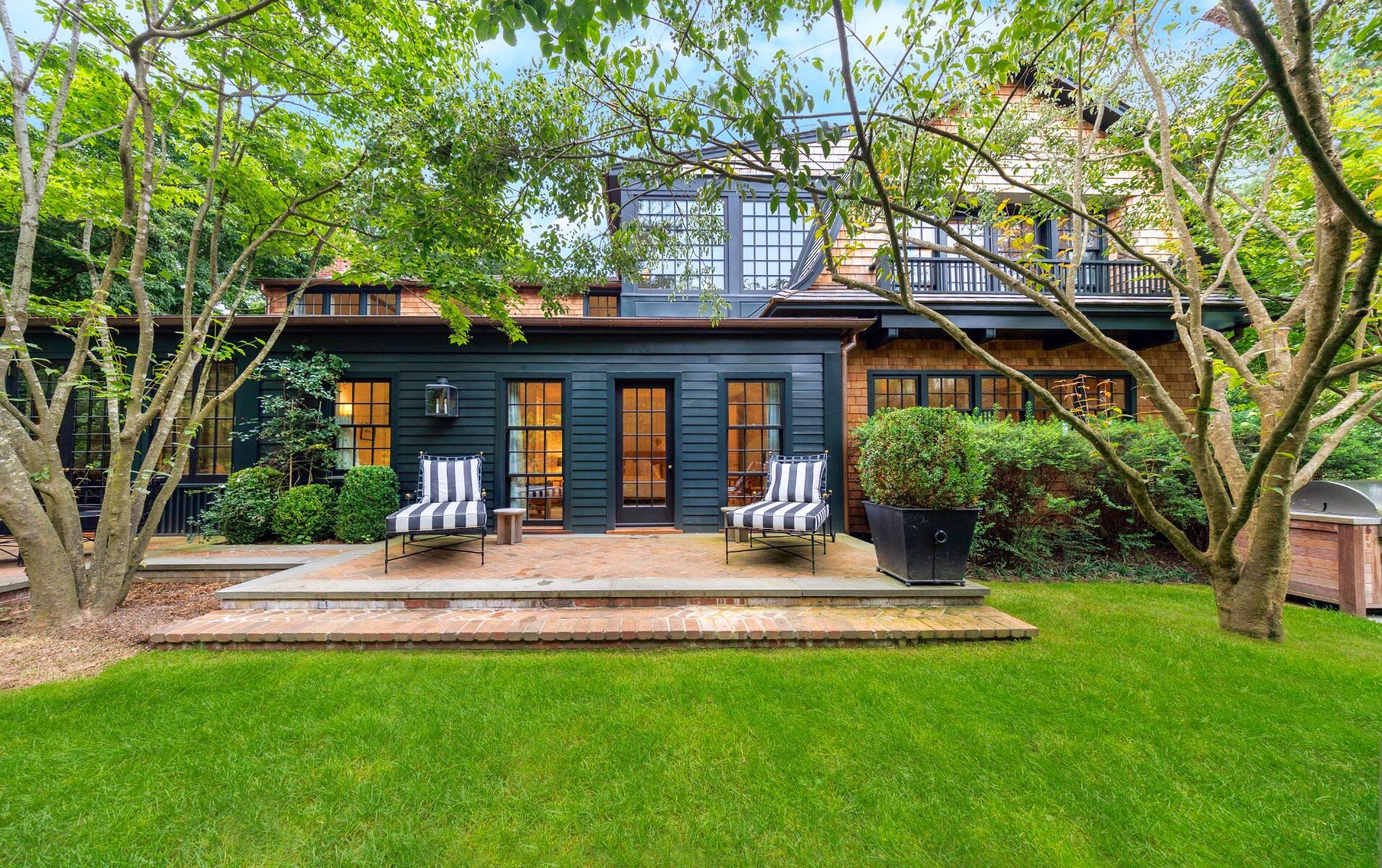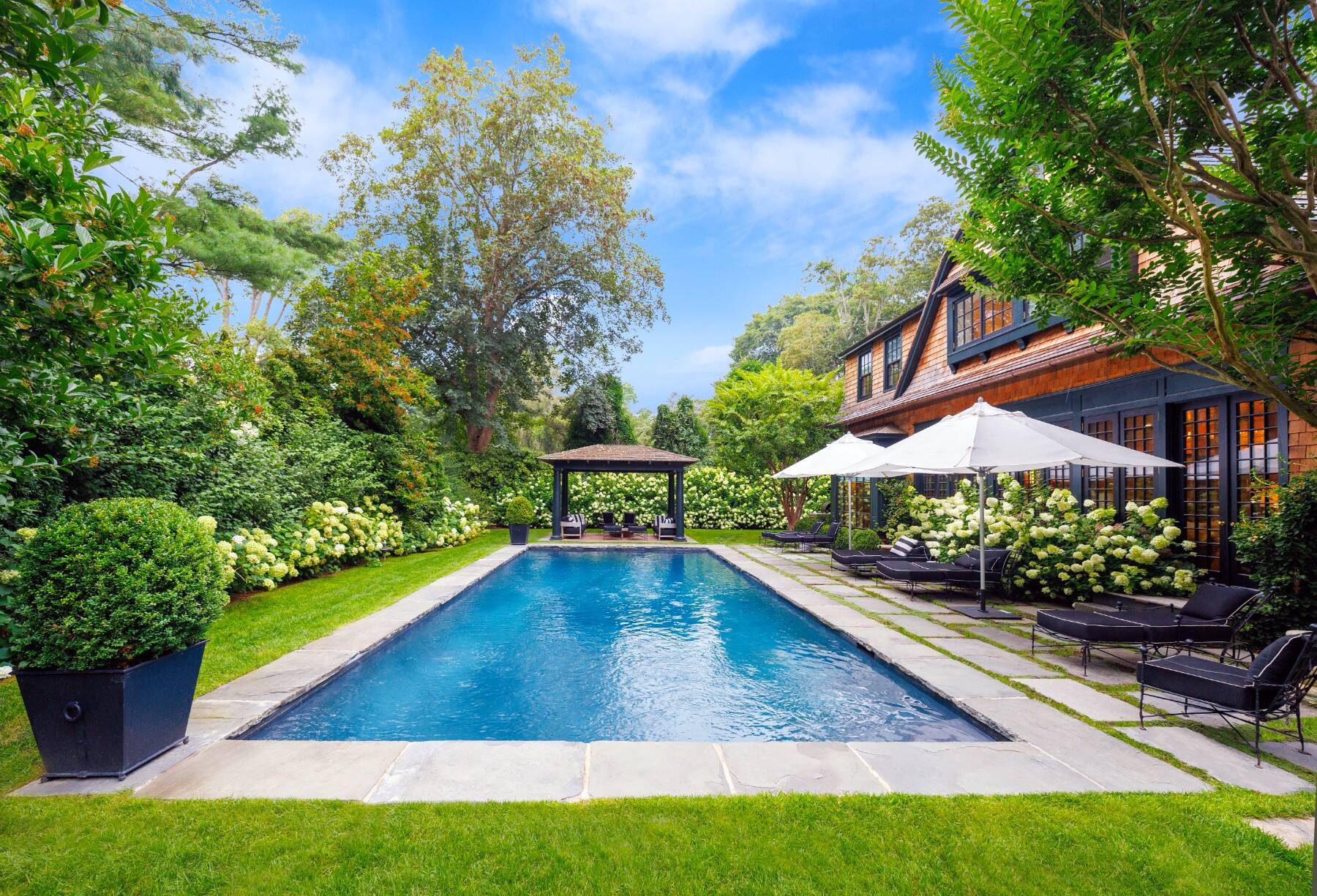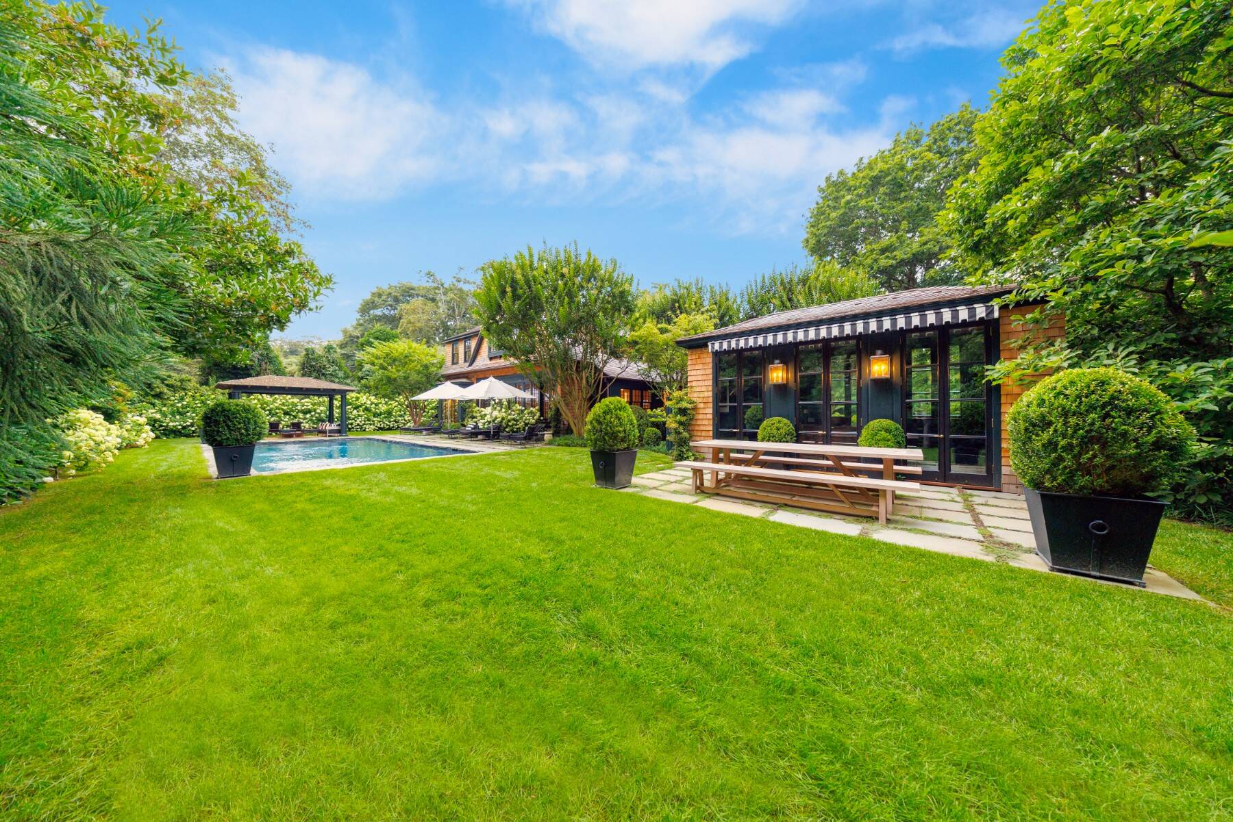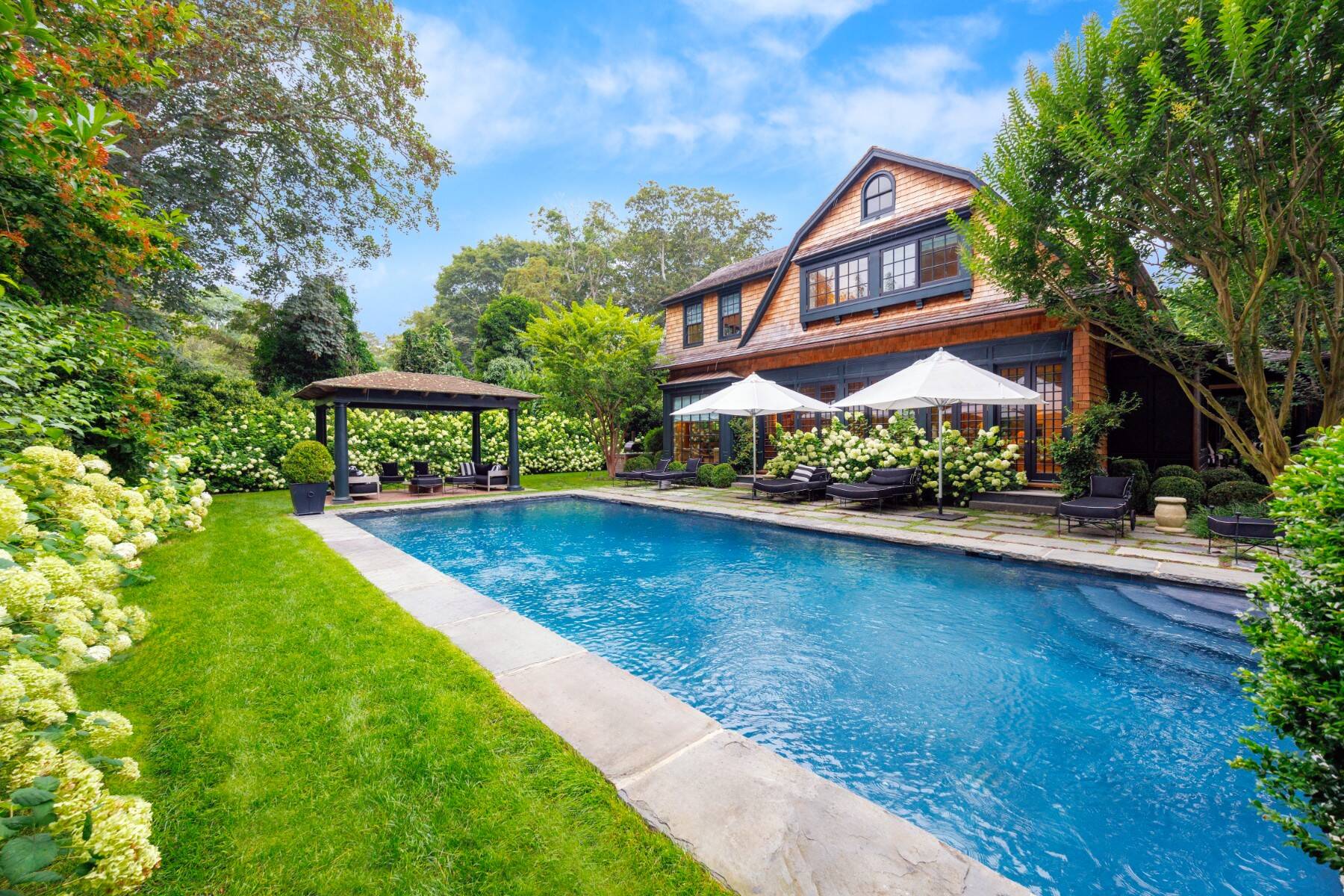 Superbly designed expansion and complete rebuild of a classic 1894 Carriage House by noted designers, this estate is hidden on an ultra-private 1.4 gated acre of park-like landscaping and gardens in prestige East Hampton Village South location minutes to Ocean and Main Street. Warm, timeless interiors featuring dramatic 25 ft x 25 ft original beamed great room with 10 ft ceilings and fireplace, French doors to large brick floored sunporch, huge family room/dining/kitchen with custom cabinetry, marble counters, and wall of windows overlooking oversized heated pool with dining pavilion and hydrangea gardens. Ground floor primary suite, plus two second floor primary suites, two additional en-suite guest bedrooms, and sun-filled upstairs sitting room. Laundry facilities on the first and second floor. Ultra-lush grounds with magnificent plantings, detached pool house and gym buildings, outdoor kitchen, and separate enchanting dining/entertaining allée with monumental stone table. An amazing turn-key oasis in a coveted south-of-the-highway location.
