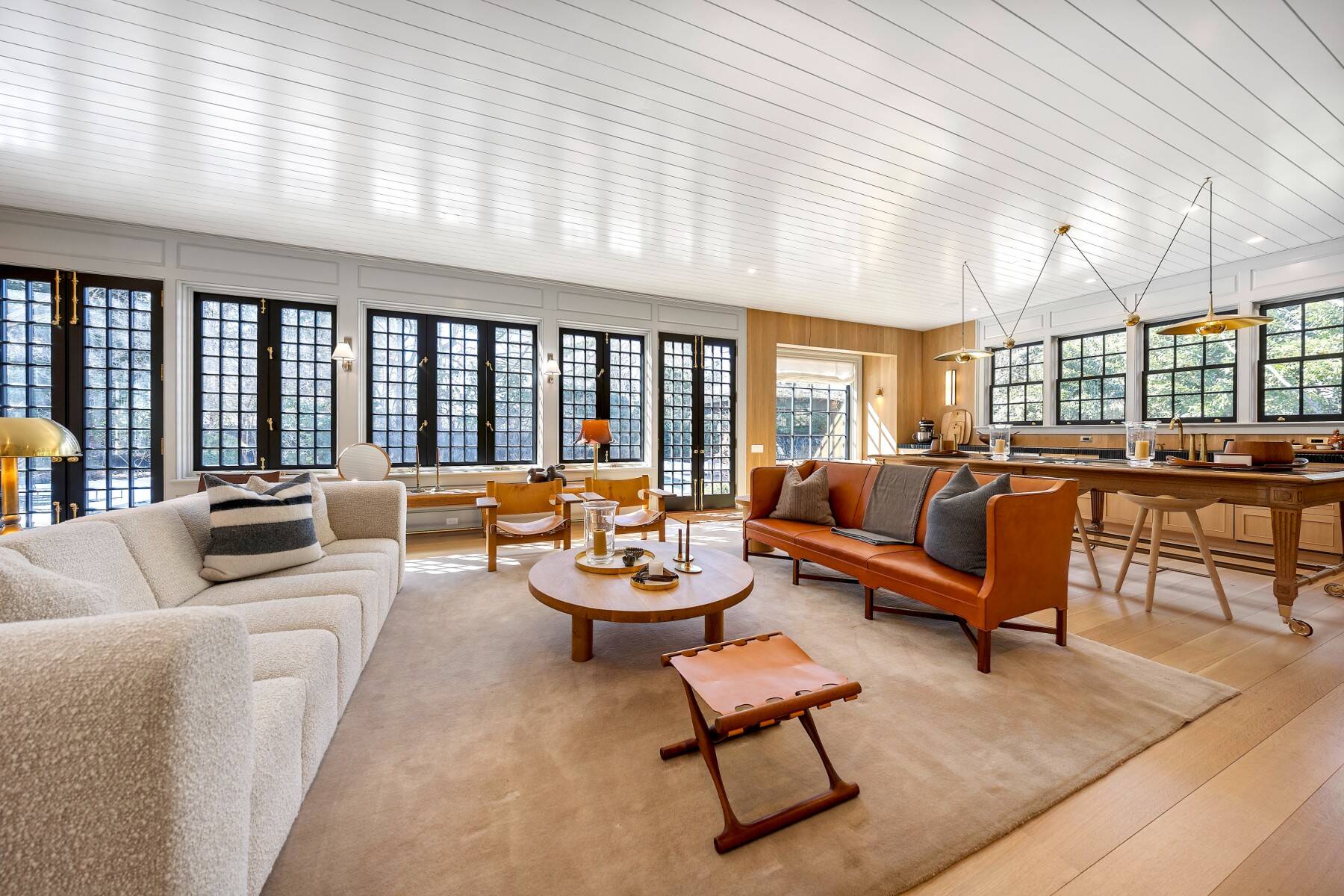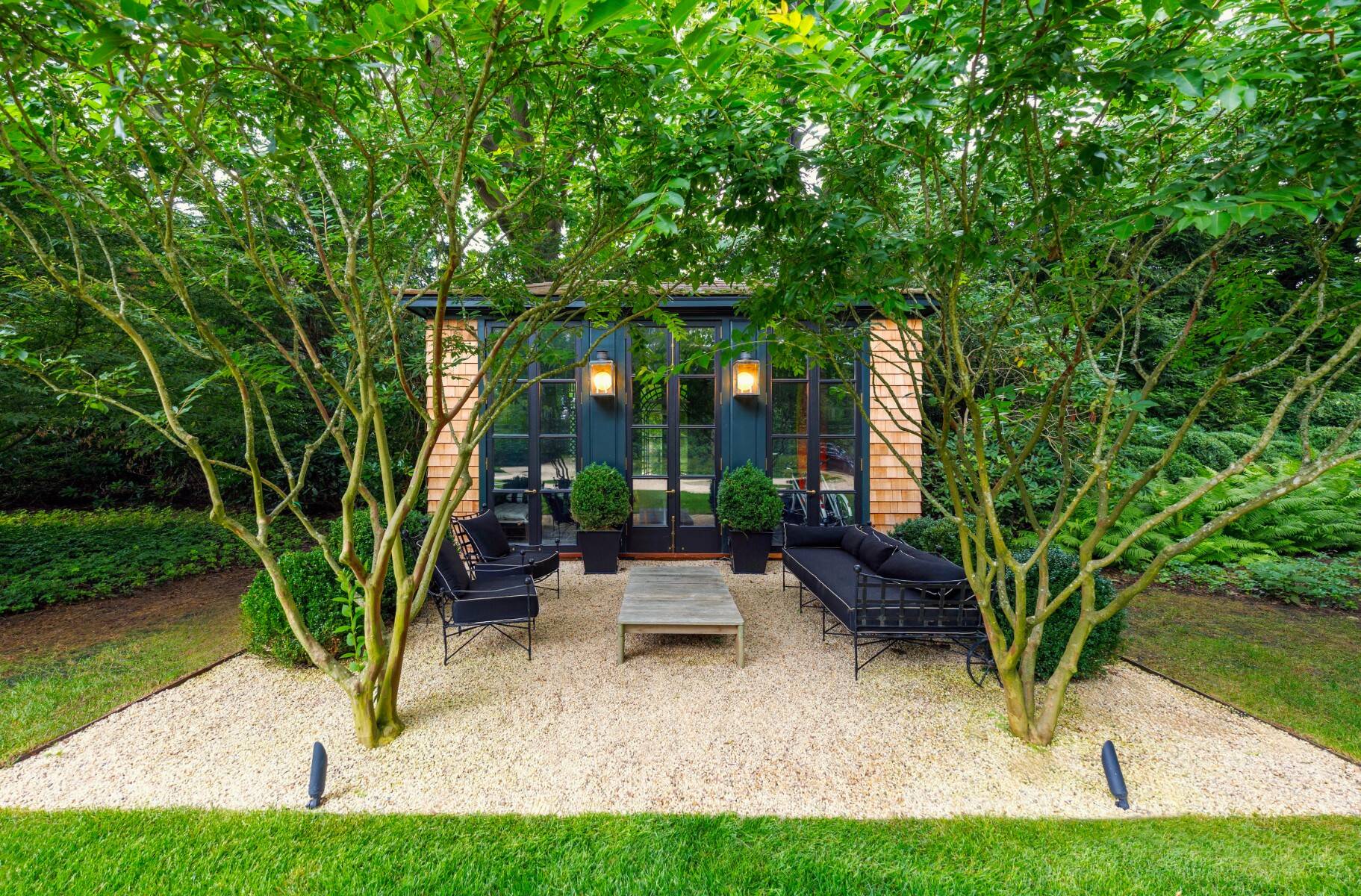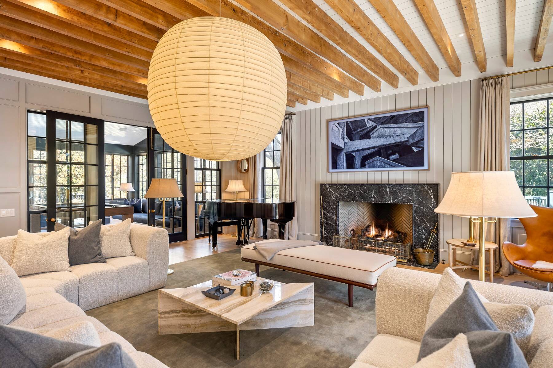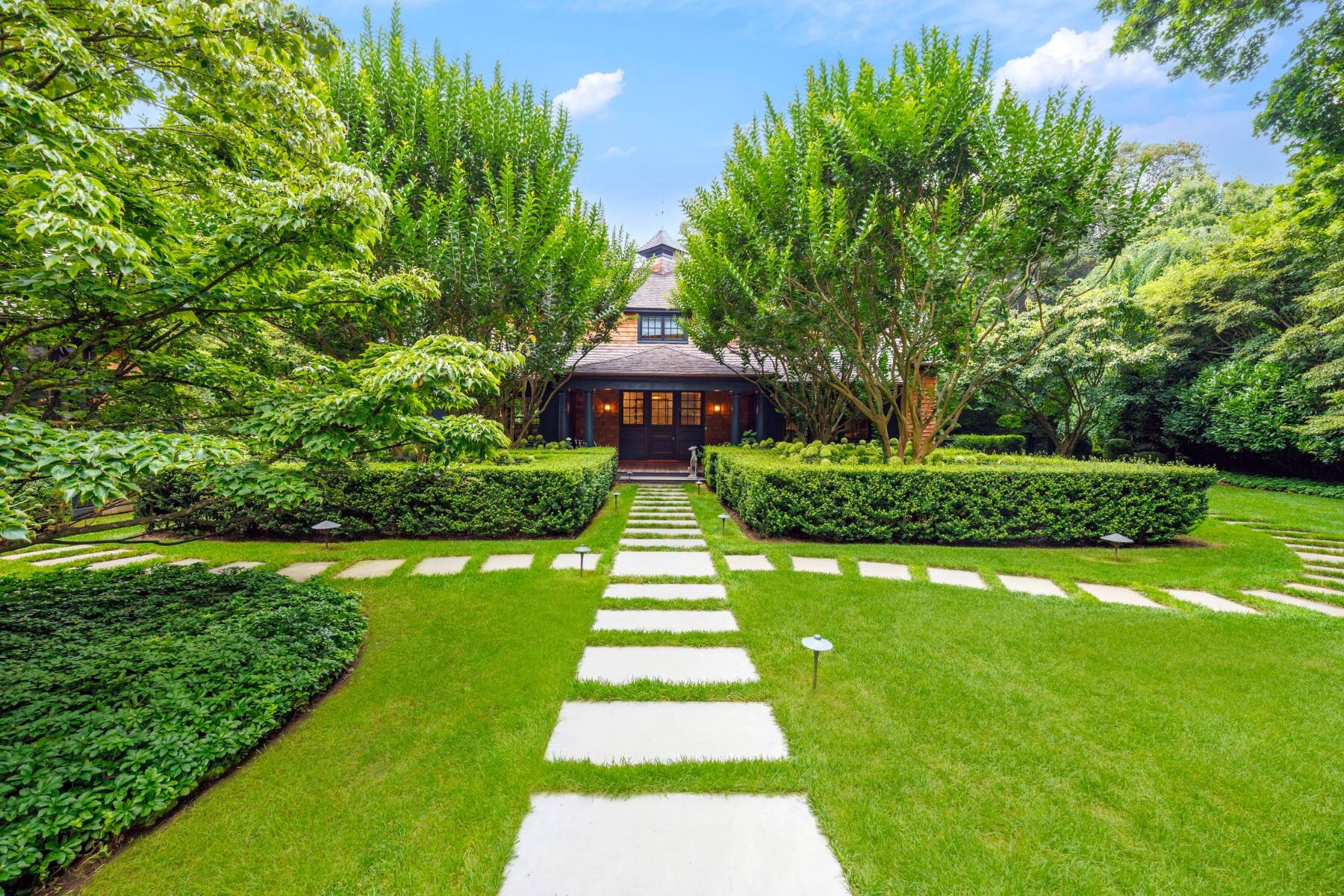Superbly designed expansion and complete rebuild of a classic 1894 Carriage House by noted designers, this estate is hidden on an ultra-private 1.4 gated acre of park-like landscaping and gardens in prestige East Hampton Village South location minutes to Ocean and Main Street. Warm, timeless interiors featuring dramatic 25 ft x 25 ft original beamed great room with 10 ft ceilings and fireplace, French doors to large brick floored sunporch, huge family room/dining/kitchen with custom cabinetry, marble counters, and wall of windows overlooking oversized heated pool with dining pavilion and hydrangea gardens. Ground floor primary suite, plus two second floor primary suites, two additional en-suite guest bedrooms, and sun-filled upstairs sitting room. Laundry facilities on the first and second floor. Ultra-lush grounds with magnificent plantings, detached pool house and gym buildings, outdoor kitchen, and separate enchanting dining/entertaining allée with monumental stone table. An amazing turn-key oasis in a coveted south-of-the-highway location.