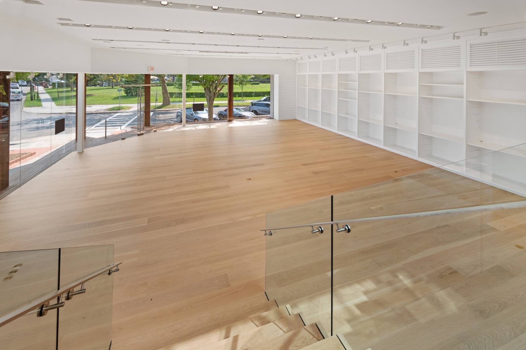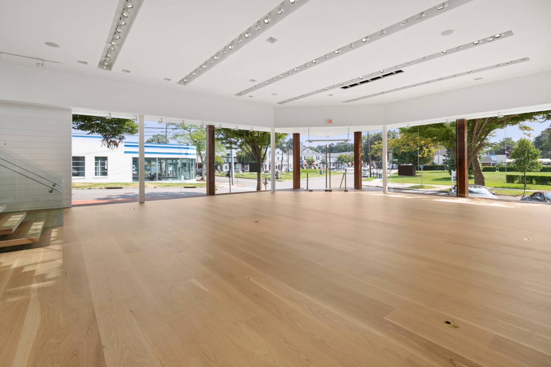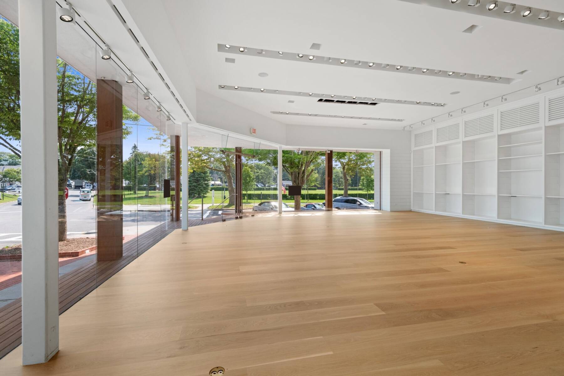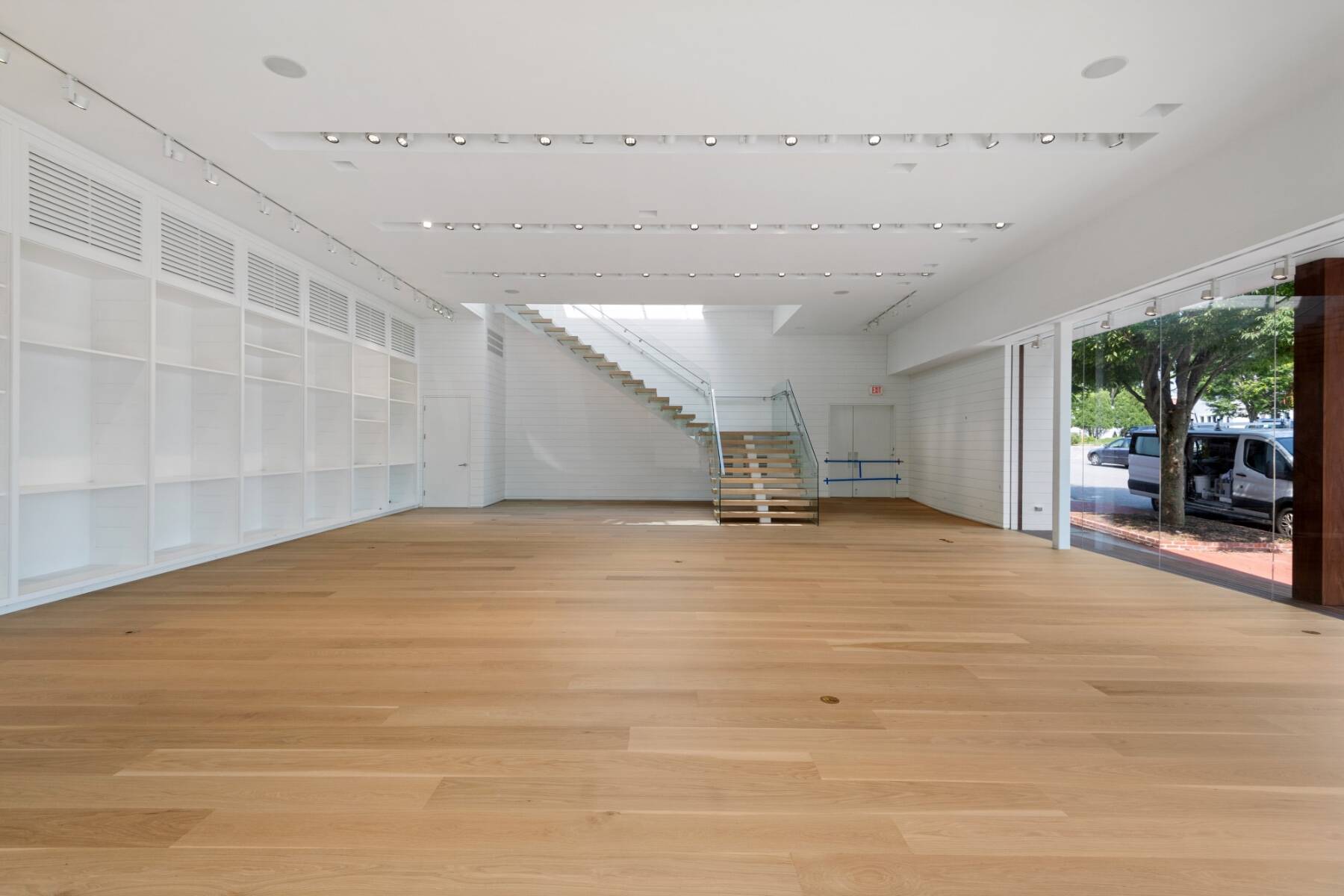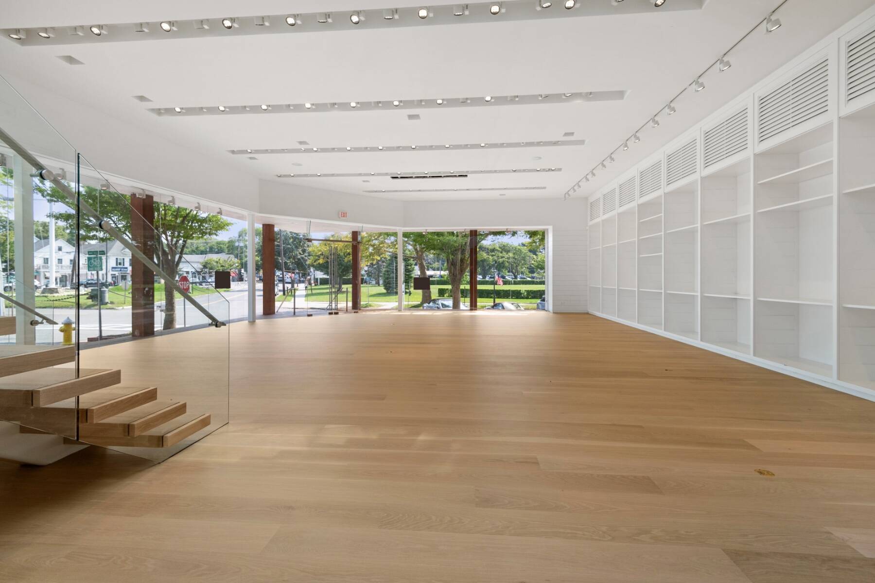 The general design inspiration for this space is Mies Van Der Rohe at the beach. The large open space act as a temple to the gorgeous east end light and the beautiful village. Clean lines and open spaces, combined with Ipe woods, Natural white oak, Ship Lap Cedar outside and Ship Lap Oak on the interior, create a warm and welcoming space. The building has the best electric, heating/ac, sound system, programmable LED lights and tracks, oak plank floors, all Reilly Ipe windows. The first floor has approx. 2,300sf and the second floor has approx. 1,200sf interior storage space and 1,000sf exterior. The second floor also features a large balcony overlooking lake Agawam. The two exterior walls of glass make the village and park part of the of the experience of the space, and from the outside, for the visibility, the interior has to pedestrians and vehicles. The natural light and large windows create the perfect environment for any retail opportunity, gallery, or even an art foundation.